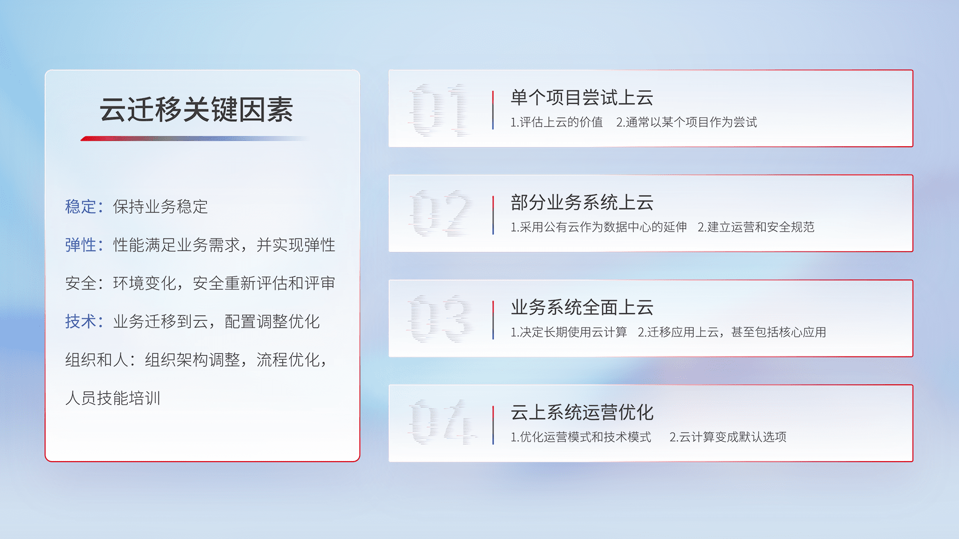结合实际业务,,,从规划设计、、、云平台选型、、、、云原生改造、、、、数据迁移、、、、集成交付,,,,迁移全过程为客户识别最佳上云路径,,,做好风险识别管理,,设计网络架构、、身份权限、、、安全审计合规、、、操作审计、、、、日志审计、、监控告警策略、、多站点容灾设计等,,对云上基础设施进行整体规划,,提升IT治理水平,,,以满足弹性、、、高可用、、、高性能的需求。。