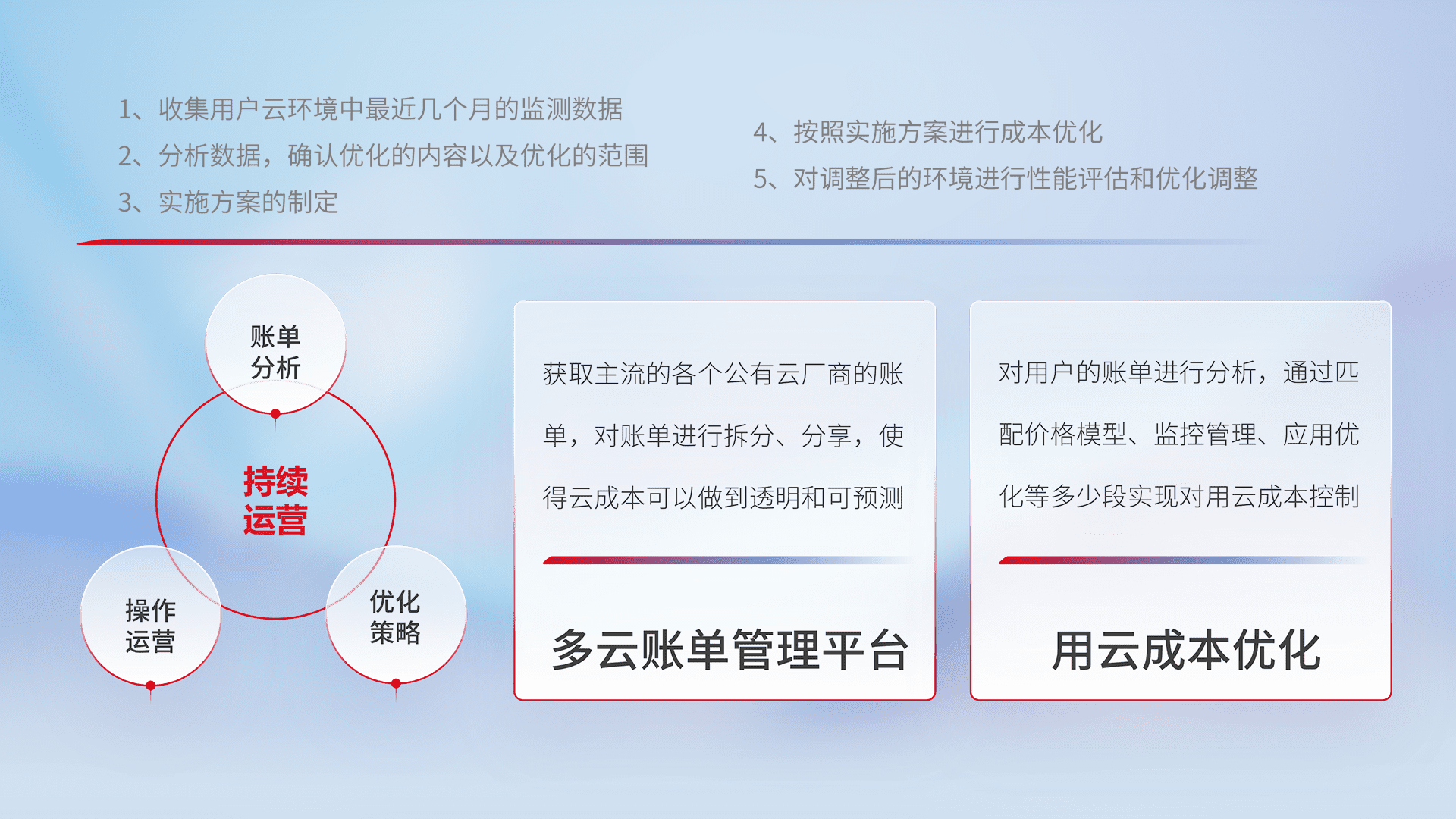 通过多云纳管,,,,以统一的资源数据模型把客户的云资源进行抽象和封装,,进而实现对多云资源的统一操作,,,,保障云资源管理的可靠性、、稳定性与可用性。。。。量身定制化运维内容,,配置、、、、开发运维、、补丁管理、、、、备份、、、监控、、认证和访问管理、、、审计和日常巡检等,,,,保障在用云过程中的可靠度,,稳定度以及高可用率。。。
